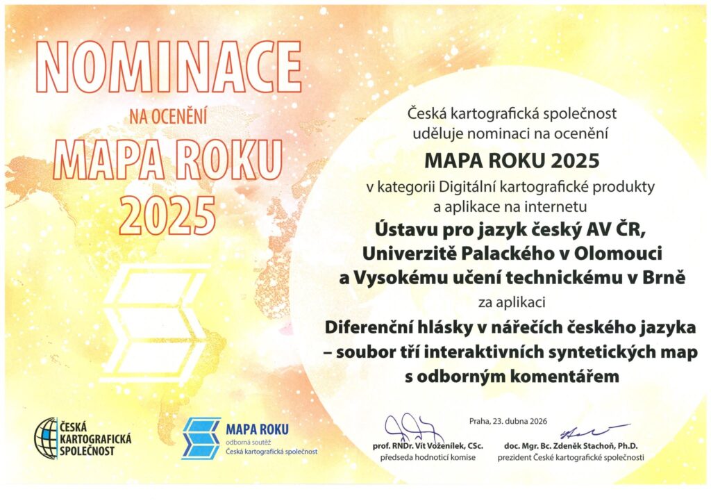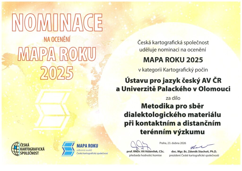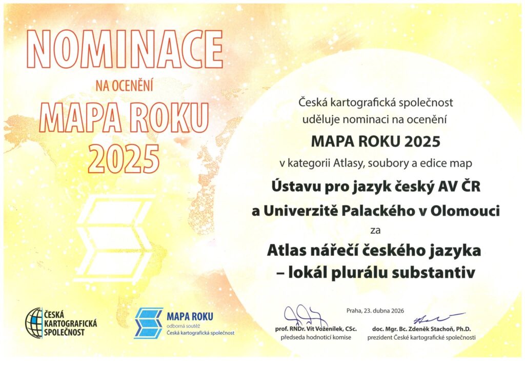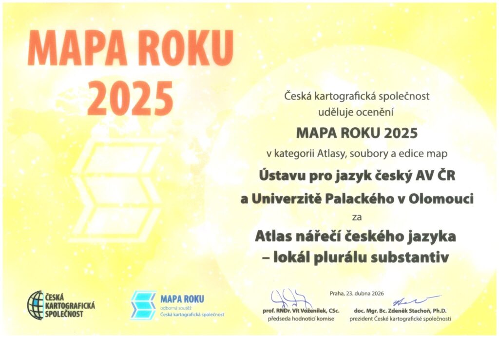 Dne 23. dubna proběhlo v Armádním muzeu Žižkov v Praze slavnostní vyhlášení soutěže Mapa roku 2025. Do soutěže byly přihlášeny a Českou kartografickou společností nominovány tři výstupy, na nichž spolupracovalo oddělení dialektologie ÚJČ. Jednu z nominací se podařilo proměnit ve vítězství – Atlas nářečí českého jazyka – lokál plurálu substantiv získal ocenění v kategorii Atlasy, soubory a edice map. Do kategorie bylo přihlášeno celkem 14 produktů od 12 vydavatelství či autorů. Více informací o aktuálním ročníku soutěže najdete zde.