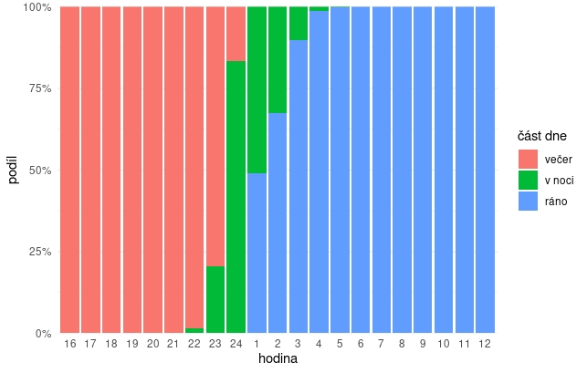 Abychom zjistili, jaký je „jazykový obraz doby noci“ v češtině, udělali jsme sondu do korpusu SYN v14. Postupně jsme v něm pomocí sledu dotazů vyhledali spojení v(e) X večer/večír; v(e) X ráno a v(e) X v noci, kde X odpovídalo slovům čtyři/čtyry/štyry/štyři, pět, šest, sed(u)m, (v)os(u)m, devět, deset, jedenáct, dvanáct, jednu, dvě a tři – např. v deset večer, ve tři ráno, v jedenáct v noci. Pokryli jsme tak rozsah cca od 15:00 do 12:00 následujícího kalendářního dne, kdy lze uvažovat o nejvčasnějším začátku večera (15:00–16:00) a nejpozdějším možném konci rána (12:00). Díky tomu jsme získali poměrně plastický obraz toho, jak uživatelé češtiny jednotlivé části dne ve svých projevech jazykově člení. (Analýzu by šlo jistě dále zjemnit, za X, tedy za místa označující čas, by šlo dosadit různé číselné formáty času – ve 2:00 ráno, v 18 večer; dalo by se pracovat i s necelými hodinami – v půl druhé ráno, ve tři čtvrtě na sedm večer atp.; za X by šlo doplnit slovo hodinu/hodiny – ve tři hodiny ráno atp., domníváme se však, že pro účely této odpovědi, je naznačený postup dostatečně přesný a vyvozené závěry jsou dobře podložené.)